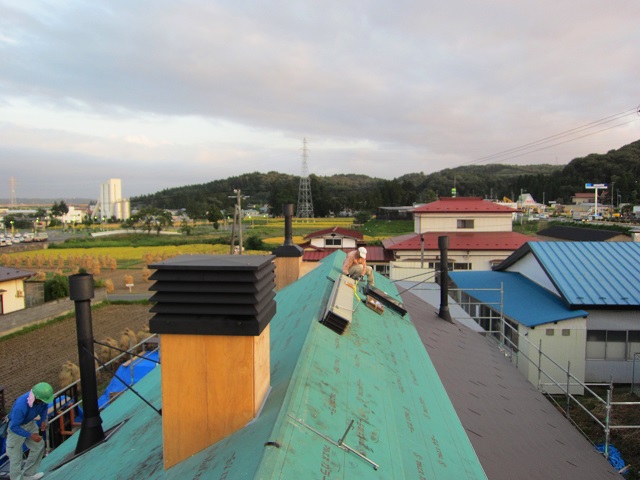まだ屋根も葺き終わってませんし、煙突回りの外壁も仕上がってませんが、屋根にこれだけ煙突がつけば薪ストーブ屋さんっぽく見えてきましたね。