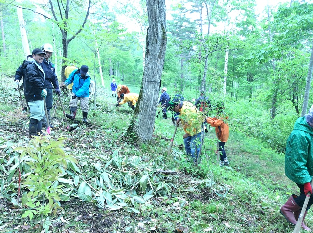 参加者全員でヤマツツジ300本、アオダモ500本の植樹。