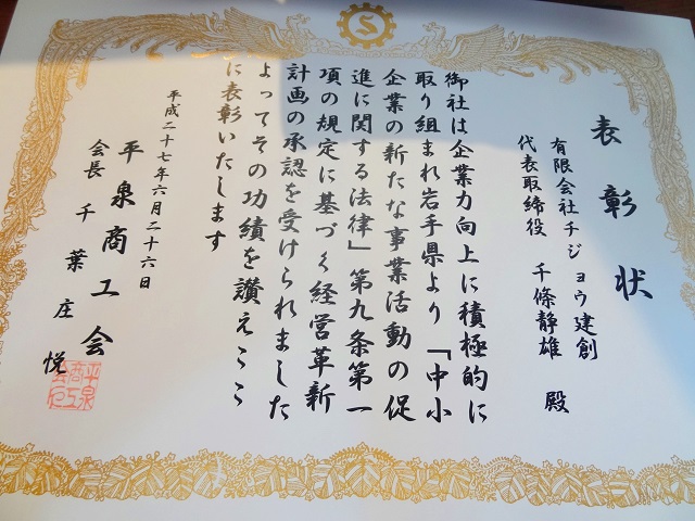 この度、岩手県商工会連合会から交付された経営革新計画認定記念章と平泉商工会長より表彰状をいただきました。