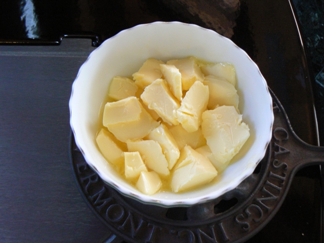 バターを耐熱皿に入れて、ストーブの上で溶かします。