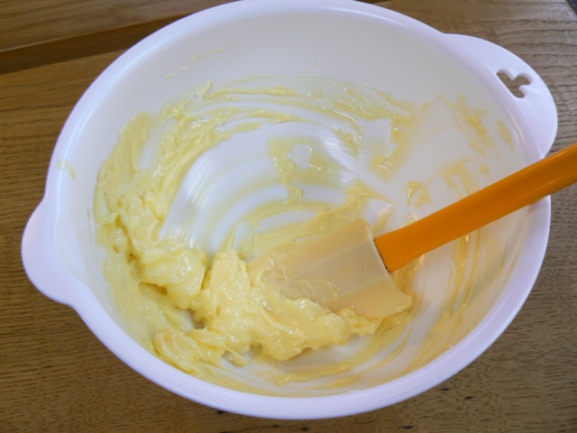 クリーム状になるまで、ゴムベラで混ぜます。