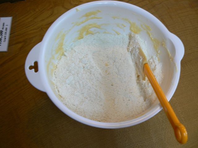 小麦粉、ベーキングパウダーを入れて混ぜます。