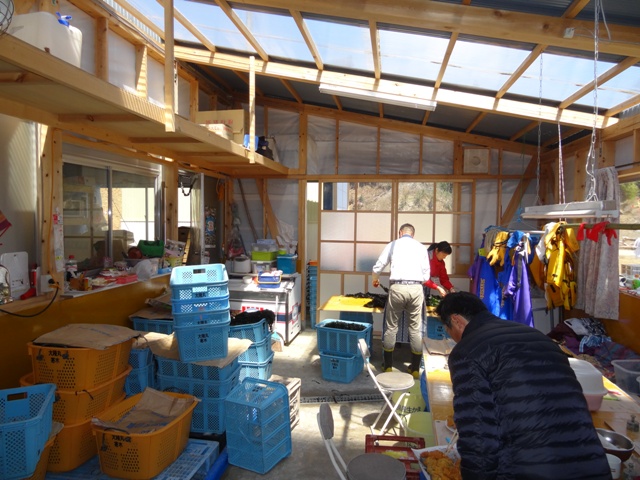 食事を頂いた場所はストーブ設置した建物のすぐ下にあるワカメの加工場で、ちょっとした社会科見学をさせてもらいました。ボランティアの方などもいて活気がありましたよ。