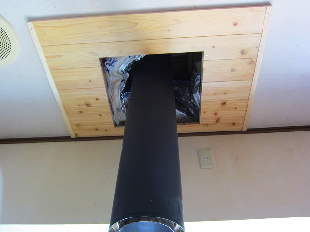 開けてビックリ天井開口。なぜここに梁が!となりましたが、ここは煙突の位置をずらして木で化粧板を造作し、むしろかっこよく仕上げよう、と頑張りました。