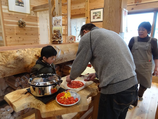 お子様が見守る中、生地を伸ばす弊社代表。