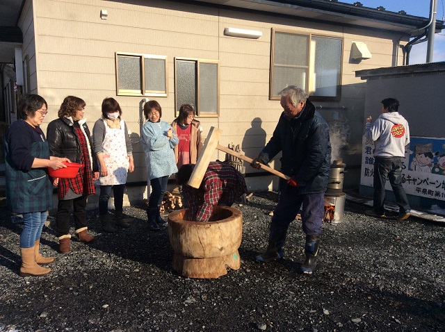 当日は屋外で蒸し、臼と杵で昔ながらの餅つきです。