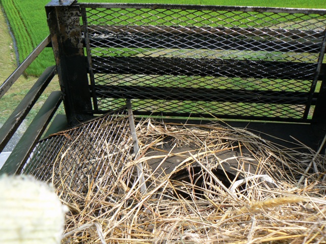 地震で角トップの防鳥網が外れたようで、中でスズメが巣を作っているようでした。