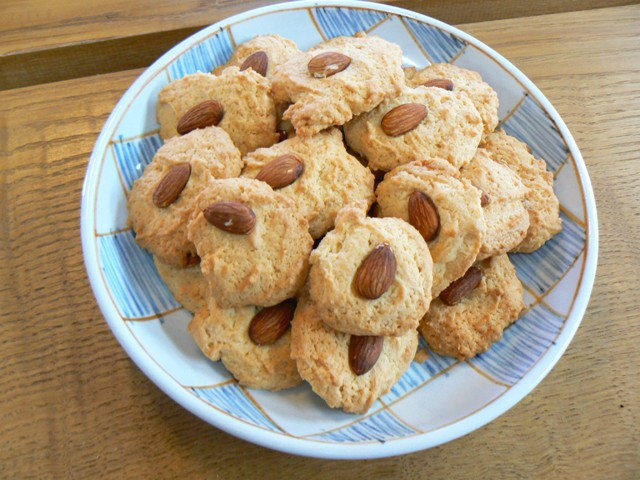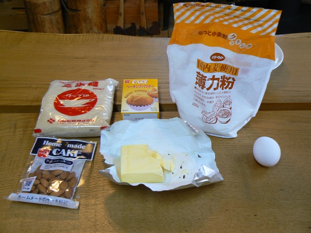 | 小麦粉 170g 砂糖 70g バター 100g 卵 1個 ベーキングパウダー 小さじ1/4 アーモンド 適量 |