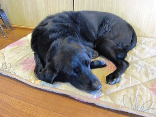薪ストーブの前がいずれ特等席になりそうな寝姿。